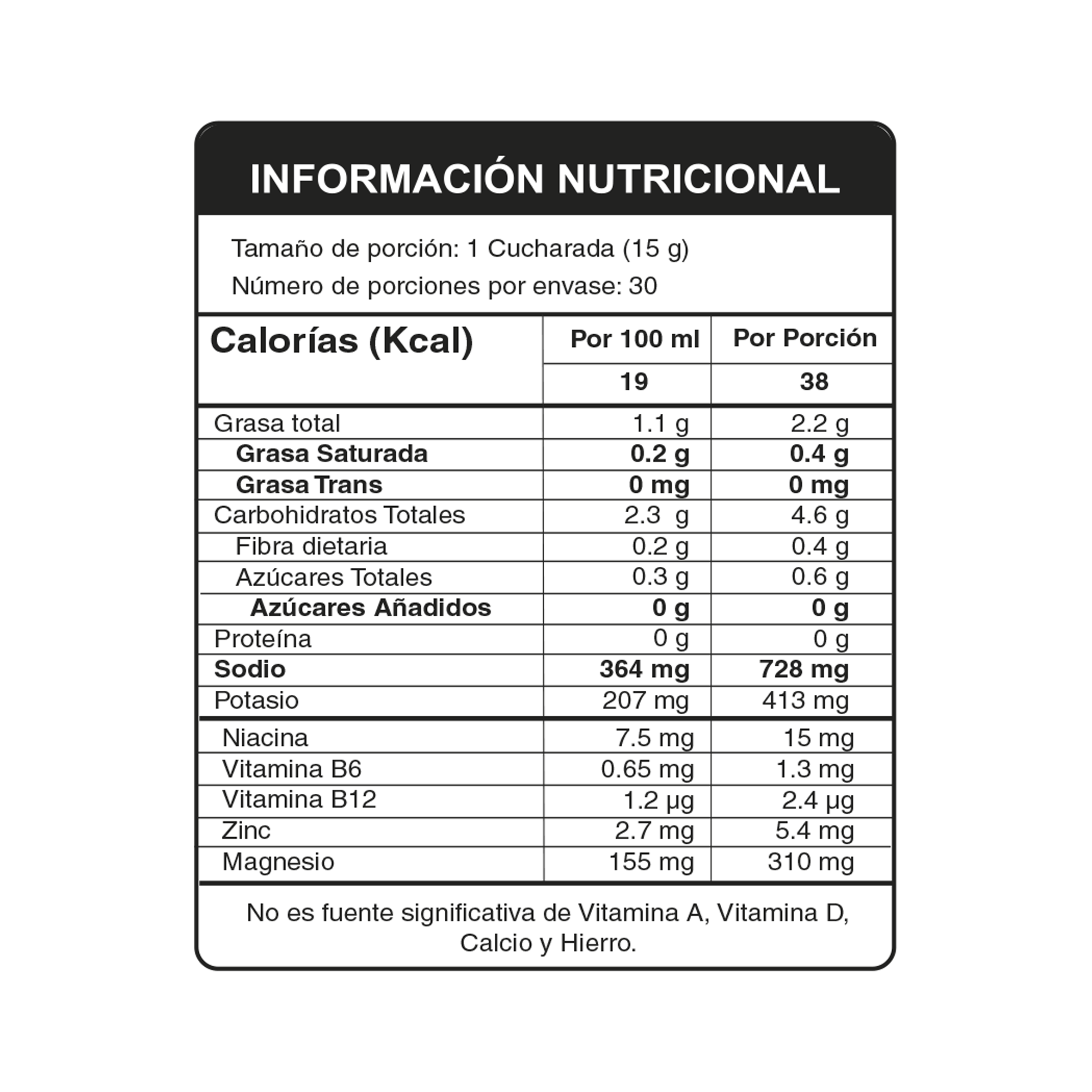 Libre de: Maltodextrina, inulina, soya, gluten y azúcar.